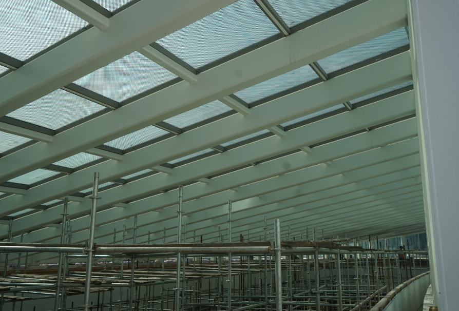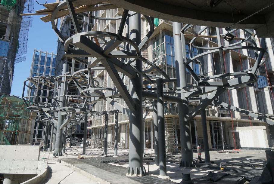 ▼商業(yè)綜合體2號(hào)采光頂為弧形結(jié)構(gòu),最大跨度43米,曲面造型呈現(xiàn)鋼結(jié)構(gòu)的力與美