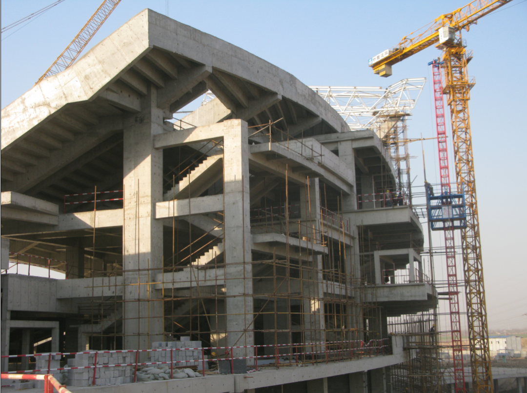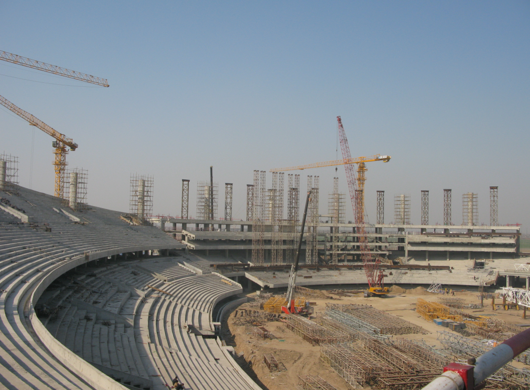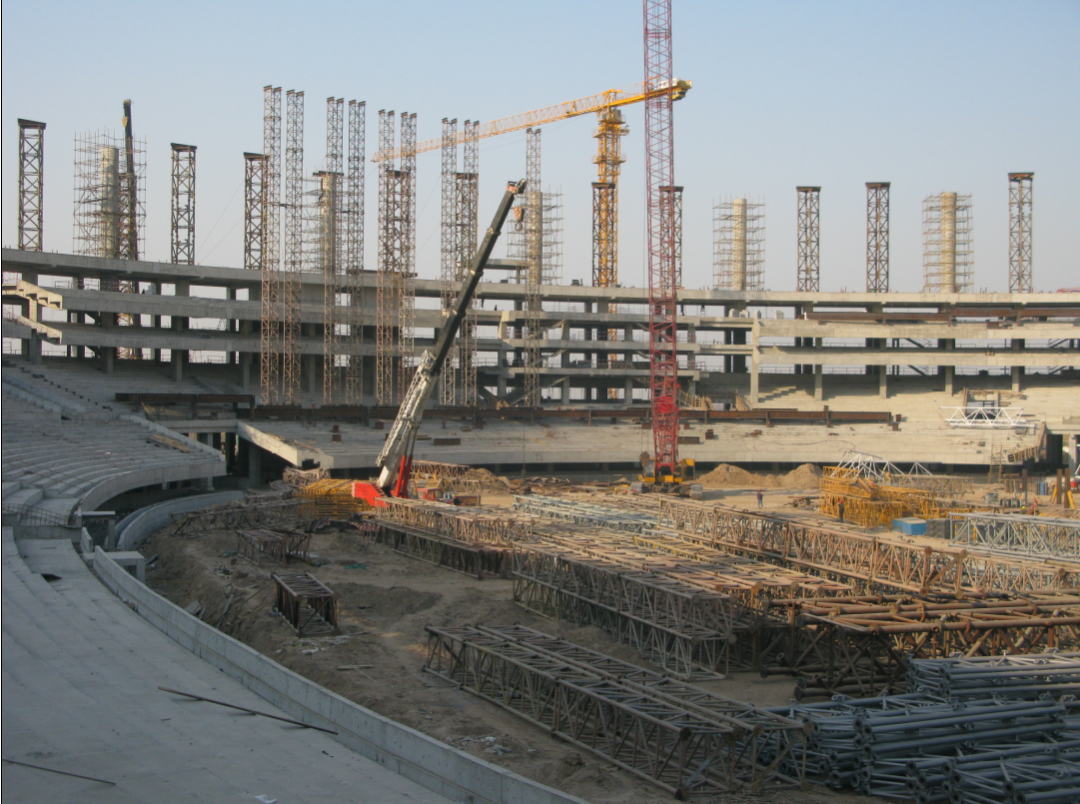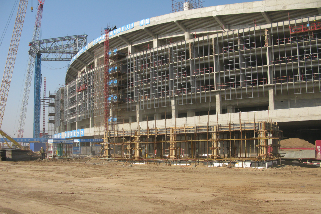 其中最為核心的體育場,位于整個奧體中心的西側(cè),占地面積118530平方米,為全國甲級大型體育場。主體結(jié)構(gòu)為為框架-剪力墻體系,屋蓋為鋼結(jié)構(gòu)大跨度空間管結(jié)構(gòu),看臺罩棚為管桁架結(jié)構(gòu)。