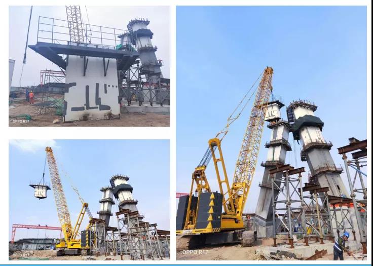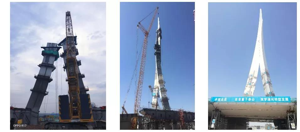 項(xiàng)目為金環(huán)承建太原真武路瀟河大橋工程,全長1.012公里,其中主橋(單塔雙索面斜拉橋)長為280米,寬度為50.5米,引橋(等截面連續(xù)梁橋)北側(cè)長360米、南側(cè)長372米,寬度37米。 該工程主橋單塔雙索面斜拉橋塔包括高矮兩塔肢,橋塔上塔柱為鋼結(jié)構(gòu),下塔柱為鋼混組合結(jié)構(gòu)。高塔與矮塔結(jié)構(gòu)相似,均為變截面梯形截面。