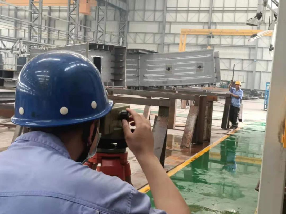 1。鋼塔線形精度控制難度高。鋼塔為半橢圓弧形橋塔,涉及非常多的不規(guī)則曲面,在分段制作中,每個分段的截面和弧度都不一樣,需要嚴格控制每一段的加工精度,已實現(xiàn)最終的完美合龍。金環(huán)建設集團技術部和詳圖部制定了詳細的加工計劃和制作工藝流程,制造人員和檢驗人員全程使用全站儀監(jiān)測鋼塔定位控制點,高精度確保鋼塔制作段定位,并現(xiàn)場復原工廠測量數(shù)據(jù),確保鋼塔順利合龍;