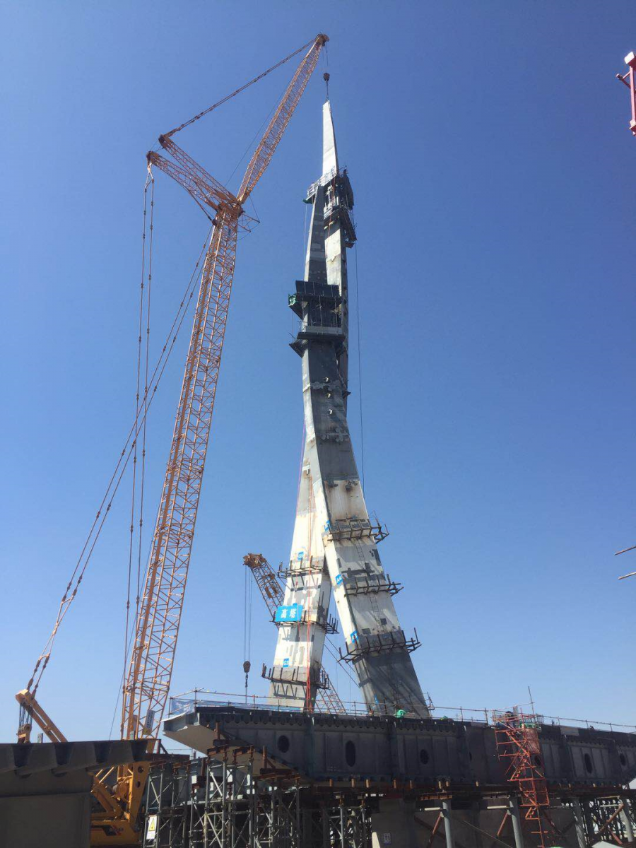 太原市真武路瀟河大橋工程跨越瀟河,全長1.012公里,其中主橋(單塔雙索面斜拉橋)長為280米,寬度為50.5米。金環(huán)建設(shè)集團主要承接了該項目中難度最大的橋塔鋼結(jié)構(gòu),及部分鋼箱梁鋼結(jié)構(gòu)的制作和安裝工作。