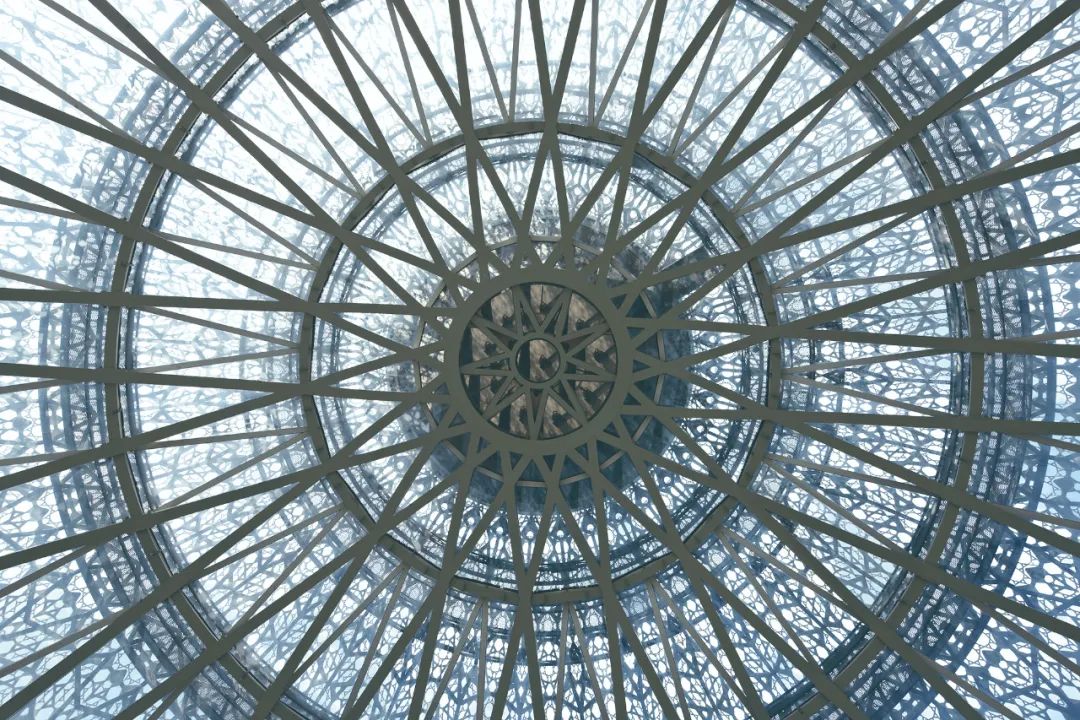 大家仔細(xì)看這座塔樓的穹頂,它是由6個(gè)從小到大的鋼結(jié)構(gòu)圓環(huán)從上到下依次排列,最外圈直徑36米,塔身四周環(huán)繞的弧形鋼梁互相交叉,撐起了這個(gè)圓筒建筑物的塔頂空間;這些鋼梁錯(cuò)落有致,將空間分割成一個(gè)個(gè)整齊有序的幾何圖形,交織成一幅生動(dòng)有趣的大型阿拉伯紋飾,展示了規(guī)則、節(jié)奏、對(duì)稱、均衡、和諧為特點(diǎn)的阿拉伯紋飾藝術(shù)特色,體現(xiàn)了伊斯蘭地域文化精神。其中最里圈里鋼結(jié)構(gòu)組成了一朵盛開的太陽花,綻放在多哈大廈的穹頂,將建筑之美體現(xiàn)得淋漓盡致。