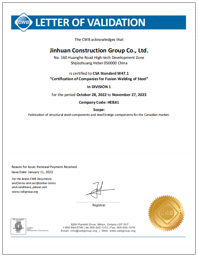 本次加拿大焊接認(rèn)證(CWB)認(rèn)證的順利通過(guò),是對(duì)金環(huán)建設(shè)集團(tuán)鋼結(jié)構(gòu)加工制造能力的高度肯定和認(rèn)可,為金環(huán)建設(shè)集團(tuán)繼續(xù)開(kāi)拓海外業(yè)務(wù),實(shí)現(xiàn)鋼結(jié)構(gòu)產(chǎn)品國(guó)際化迅速發(fā)展提供了有力的支撐。