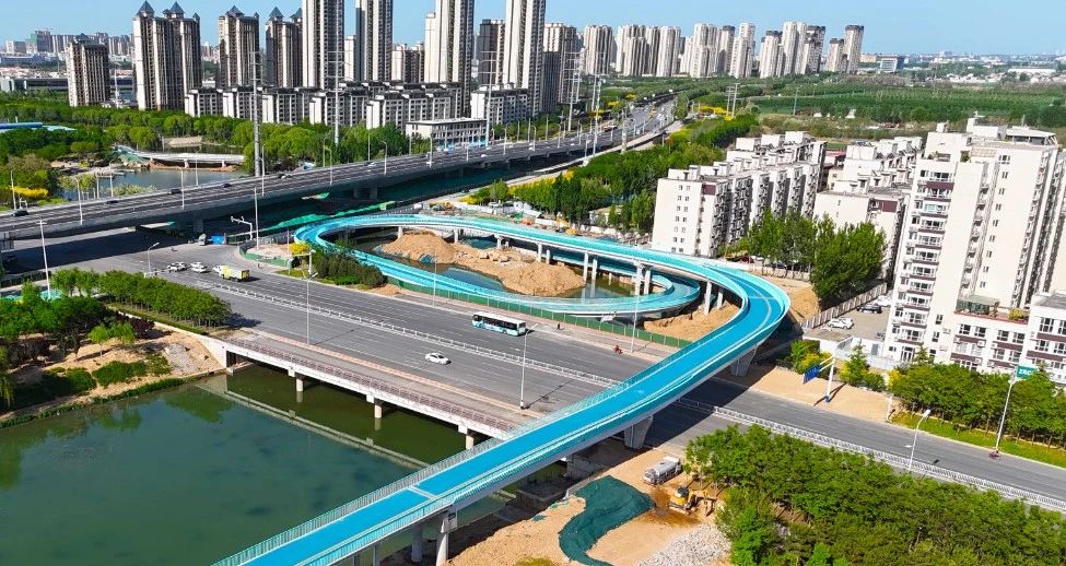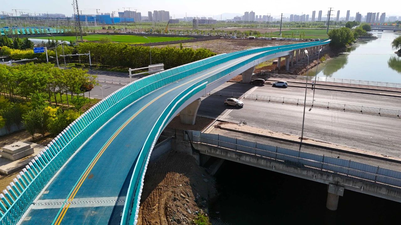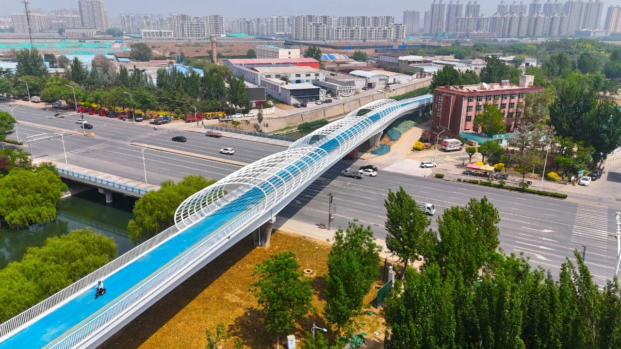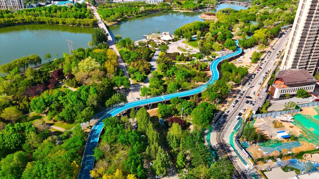 這座由金環(huán)鋼結(jié)構(gòu)參與建設(shè)的石家莊環(huán)城綠道,臨河而建、遇水搭橋,橫跨道路、蜿蜒飄逸,穿梭于城市道路和公園美景之間,仿佛一條綠色絲帶飄落在城市中間。