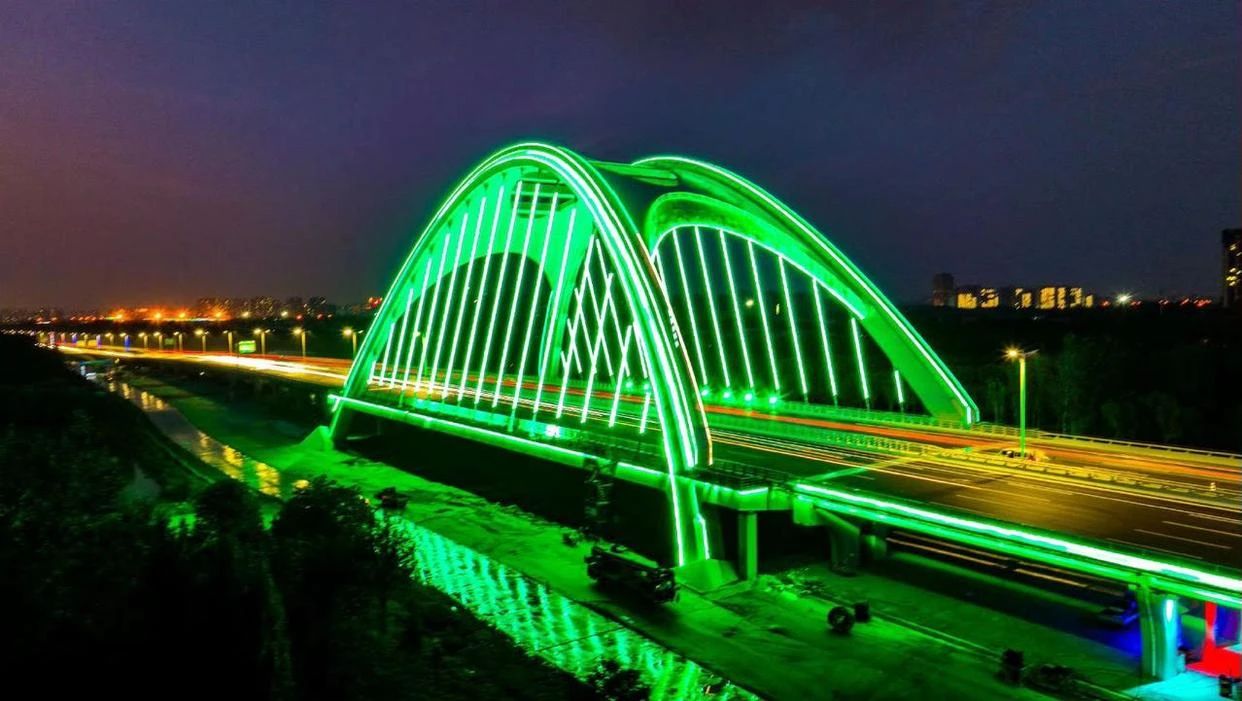 泊水公園特大橋是石家莊市復(fù)興大街市政化改造項(xiàng)目的控制性工程之一,跨越泊水公園環(huán)城水系,全長1111米,其中主橋?yàn)?-130米中承式鋼箱拱橋,主拱跨徑117米,為六邊形鋼箱結(jié)構(gòu),拱高48.51米。金環(huán)承建該橋梁主橋鋼拱和橋面鋼箱梁制作和安裝工作,累計(jì)用鋼量5600余噸。