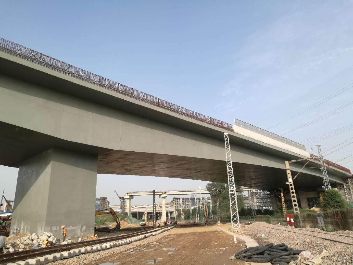 ■ XU21鋼箱梁橋,全長168m,沿線路走向分為83m+85m兩跨變高度鋼箱梁,橋底距鐵路高度約3米;