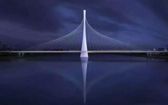 ■ 橋梁采用獨塔空間索面斜拉橋結構形式,跨徑布置為30+150+150+30=360m,斜拉索倒排布置形成空間曲面;