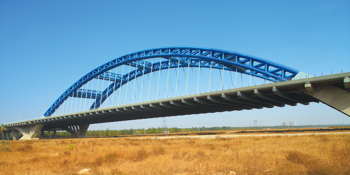 ■ 主橋橋型為三跨(40米+200米+40米)中承式提籃系桿拱橋,主拱肋為鋼管混凝土桁架;
