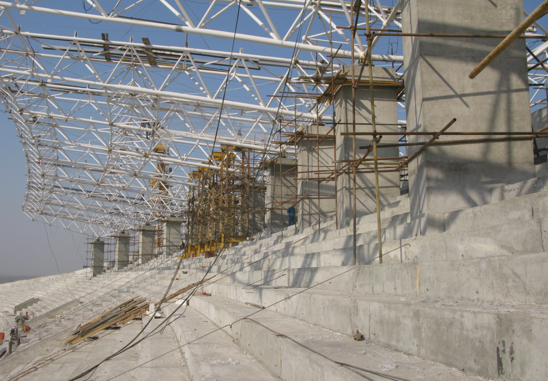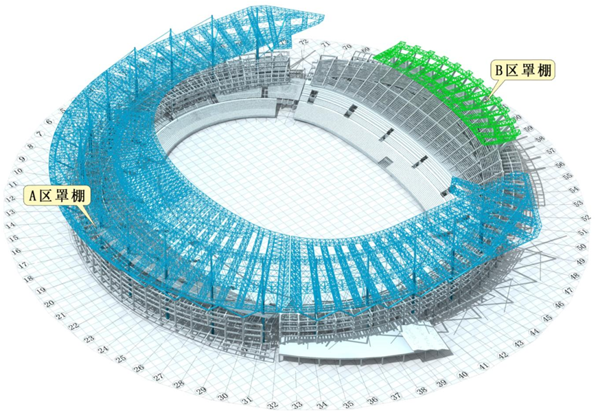 其中最為核心的體育場,位于整個(gè)奧體中心的西側(cè),占地面積118530平方米,為全國甲級(jí)大型體育場。主體結(jié)構(gòu)為為框架-剪力墻體系,屋蓋為鋼結(jié)構(gòu)大跨度空間管結(jié)構(gòu),看臺(tái)罩棚為管桁架結(jié)構(gòu)。