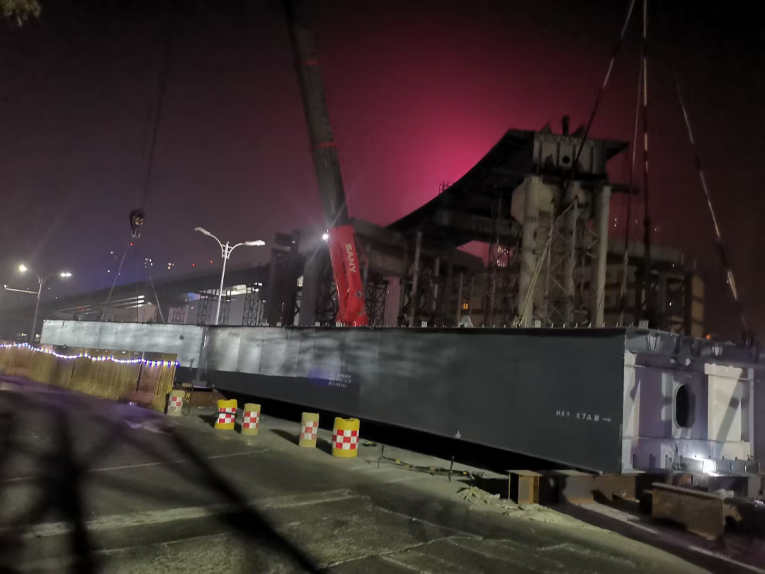 按照施工要求,現(xiàn)場吊裝只能安排到深夜12點至6點進行,來自金環(huán)的建設(shè)者們不畏寒冷、不懼挑戰(zhàn),倒班堅守在吊裝一線,真實上演了“沒有做不到的,只有想不到的”的場面,憑借著這股不畏挑戰(zhàn)、攻堅克難的精神,項目在解決了一個又一個“攔路虎”中穩(wěn)步向前推進,終于迎來了最后一節(jié)鋼箱梁的順利吊裝。