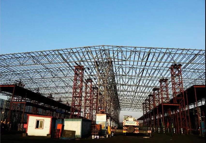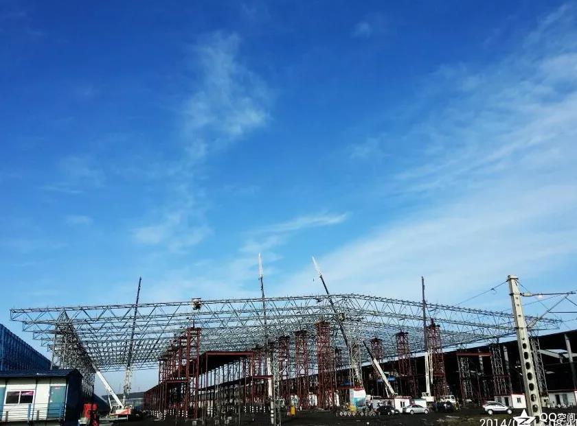 鋼結(jié)構(gòu)長1660米,寬123米,用鋼量8316噸,其中屋蓋桁架及下部支撐柱6109噸,屋面檁條1891噸鋼結(jié)構(gòu)現(xiàn)場地面拼接,在工期時間僅有4個月的情況下,工程任務(wù)非常大。