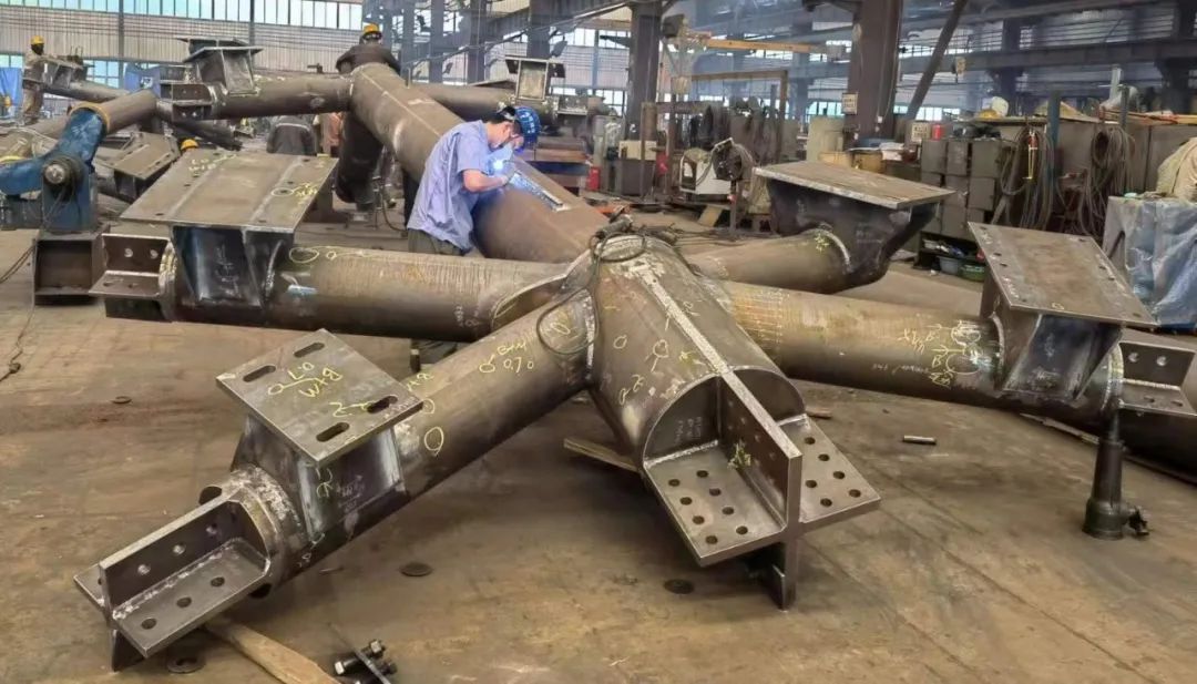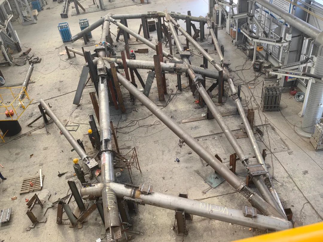可以說,金環(huán)承接的這部分管桁架網(wǎng)狀鋼結(jié)構(gòu),是整個(gè)籃球館所用鋼結(jié)構(gòu)中生產(chǎn)加工難度最大的部分,它兼具了曲面造型&節(jié)點(diǎn)復(fù)雜、外露鋼結(jié)構(gòu)級(jí)別高、厚壁焊接等難點(diǎn),同時(shí)全程接受監(jiān)理的過程監(jiān)督和檢驗(yàn),為生產(chǎn)加工工作帶來了極大的挑戰(zhàn)。