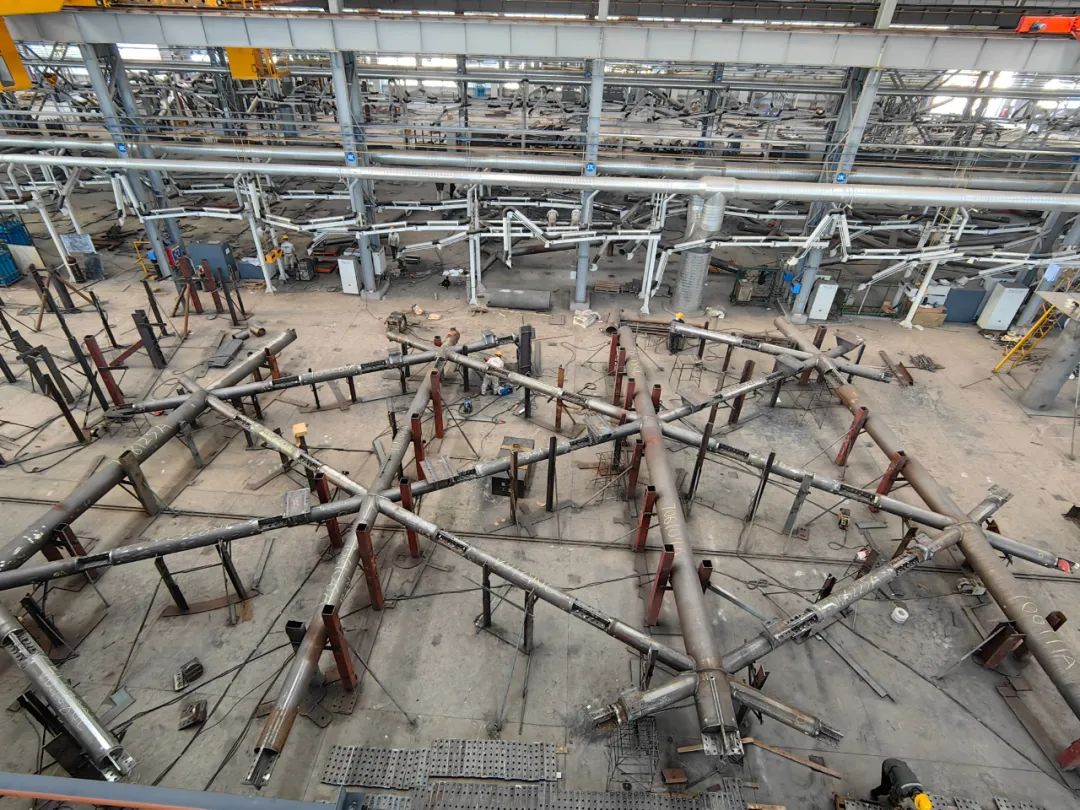 ▼預(yù)拼裝:為確保加工精度,在車間現(xiàn)場(chǎng)進(jìn)行軸線和分片預(yù)拼裝。