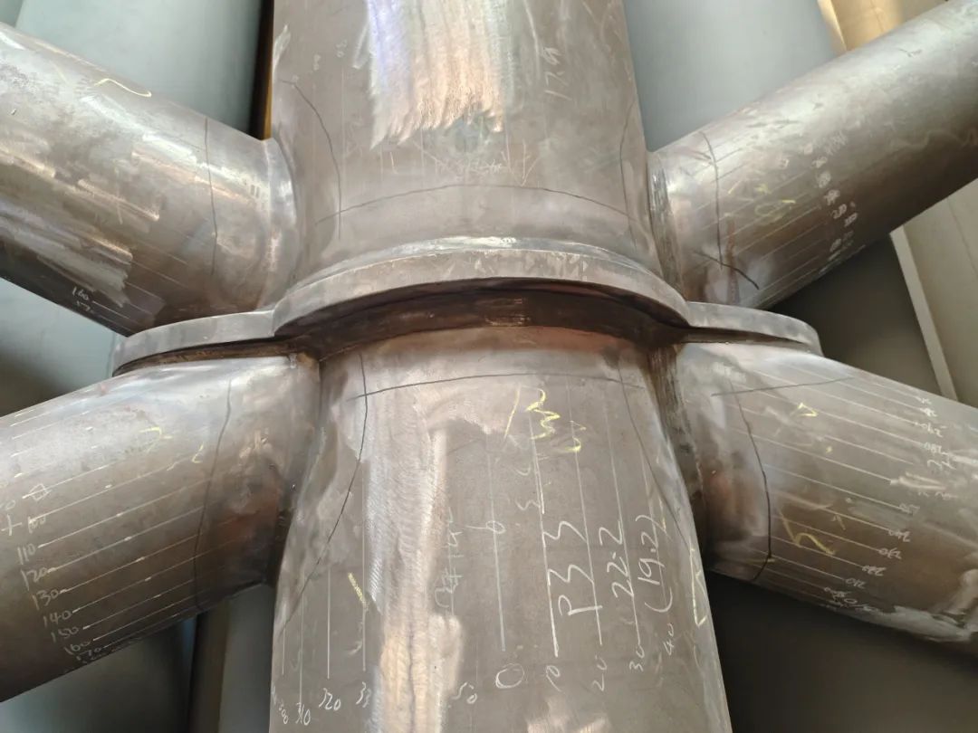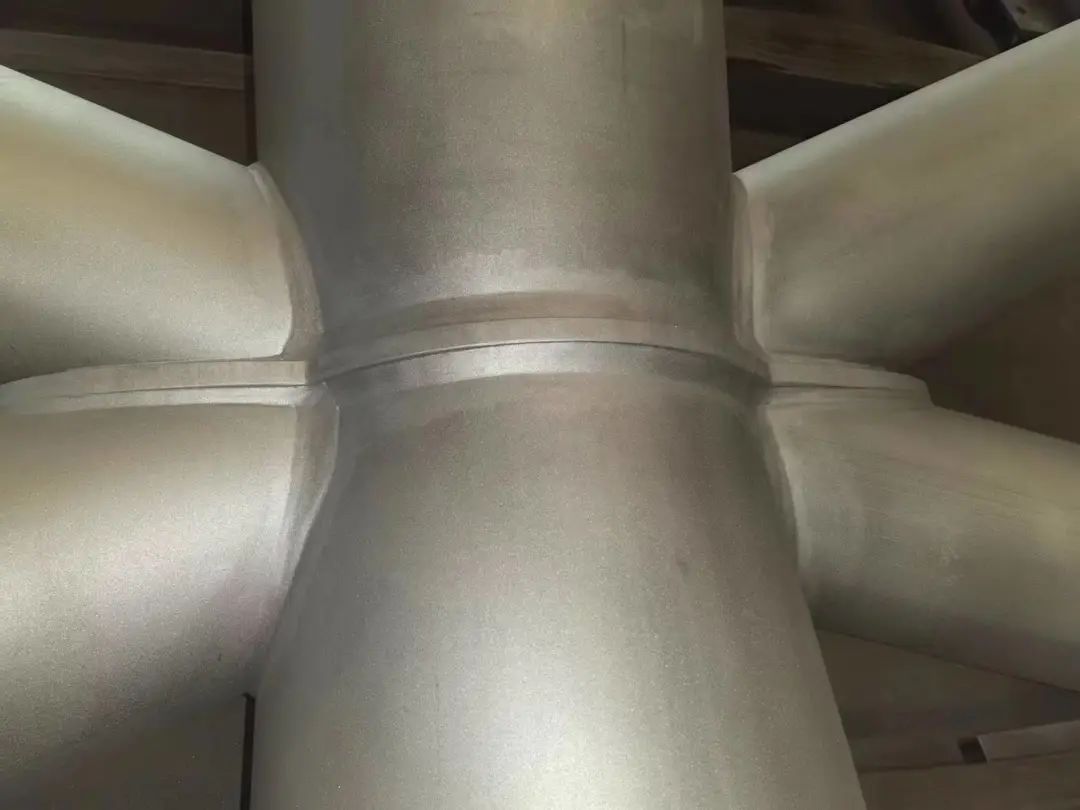 ▼噴砂除銹:嚴(yán)格按照規(guī)范要求進(jìn)行噴砂除銹。下圖為AESS構(gòu)件除銹后的完成效果,可以看到,構(gòu)件表面光滑亮澤,連接節(jié)點(diǎn)平整順滑,整個(gè)構(gòu)件渾然一體,幾乎看不到焊縫的存在。